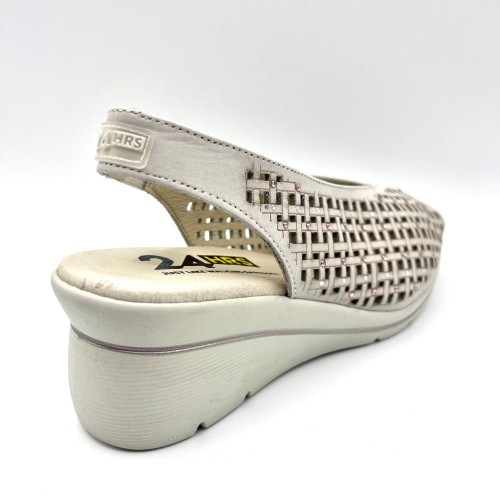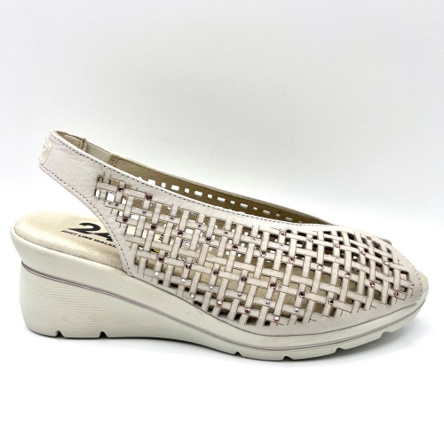 Peep toe mujer diseñado en piel calada crema con acabado en nobuck. Elástico lateral para facilitar el calzado, detalles en pedrería y costuras vistas. Suela bicolor PU alta calidad con cuña de 6 cm y tecnología exclusiva 24HRS. El clásico por excelencia de cada verano.