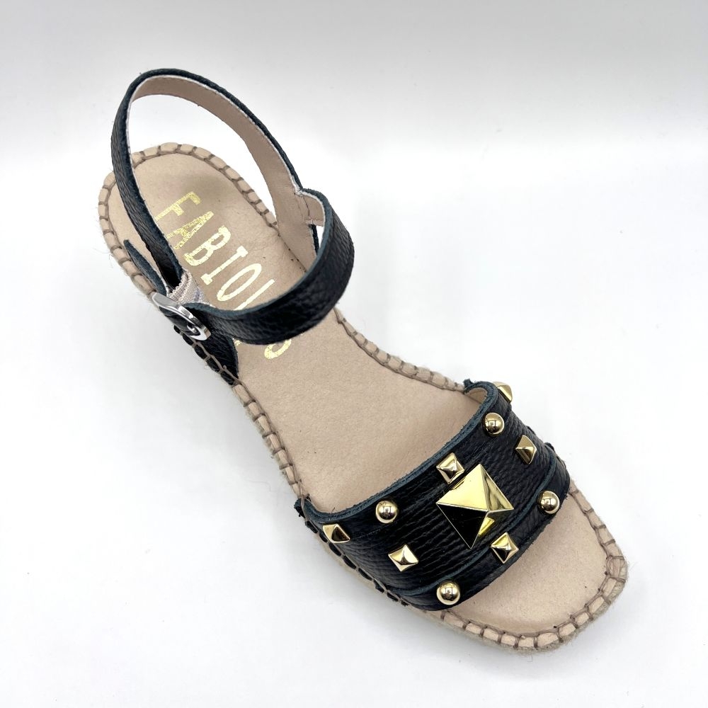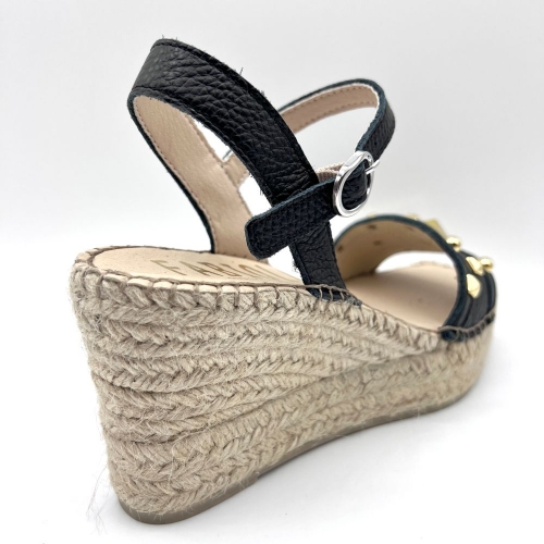Sandalia abierta de cuña alta con puntera cuadrada elaborada en fantasy negro.