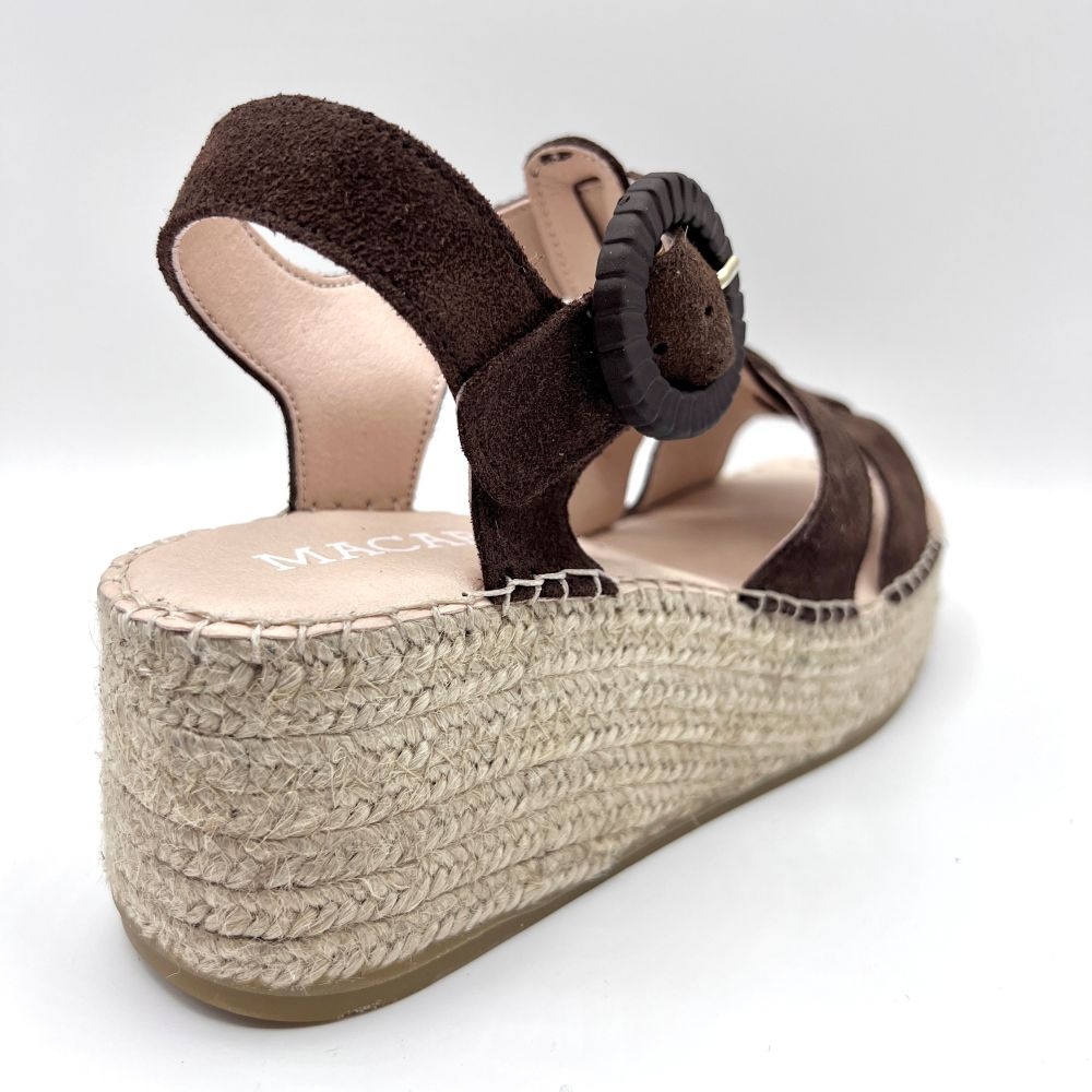 Artesanal, versátil y con carácter. Nuestra sandalia de plataforma con cuña en esparto y serraje color marrón café destaca por su diseño cruzado, elegante y funcional, perfecto para el día a día de verano.