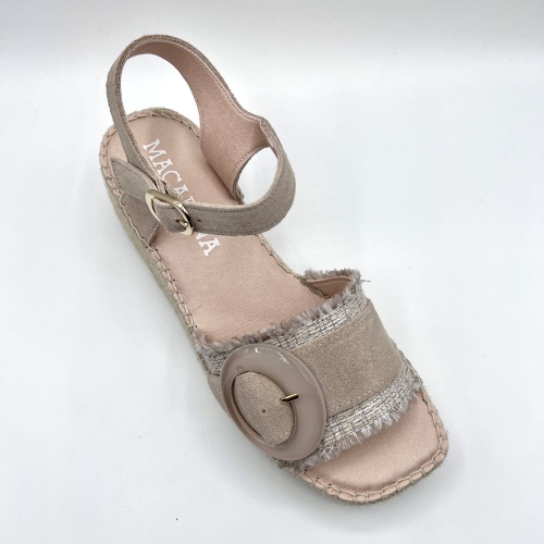 La gran hebilla circular en acabado tono neutro se convierte en el elemento protagonista del diseño, aportando carácter y un guiño distintivo que equilibra modernidad y artesanía. Su silueta estilizada se alza sobre una cuña de esparto natural trenzado, que refuerza su esencia y estiliza la figura con ligereza visual.