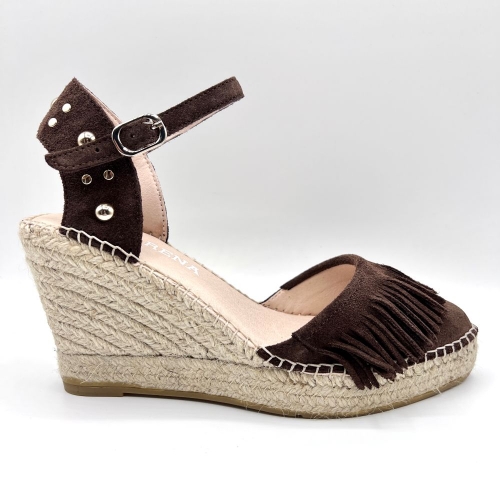 Femeninas y con un marcado aire artesanal. Confeccionadas en suave serraje color café, destacan por el delicado detalle de flecos en la pala, que aporta movimiento y un sutil guiño bohemio.
