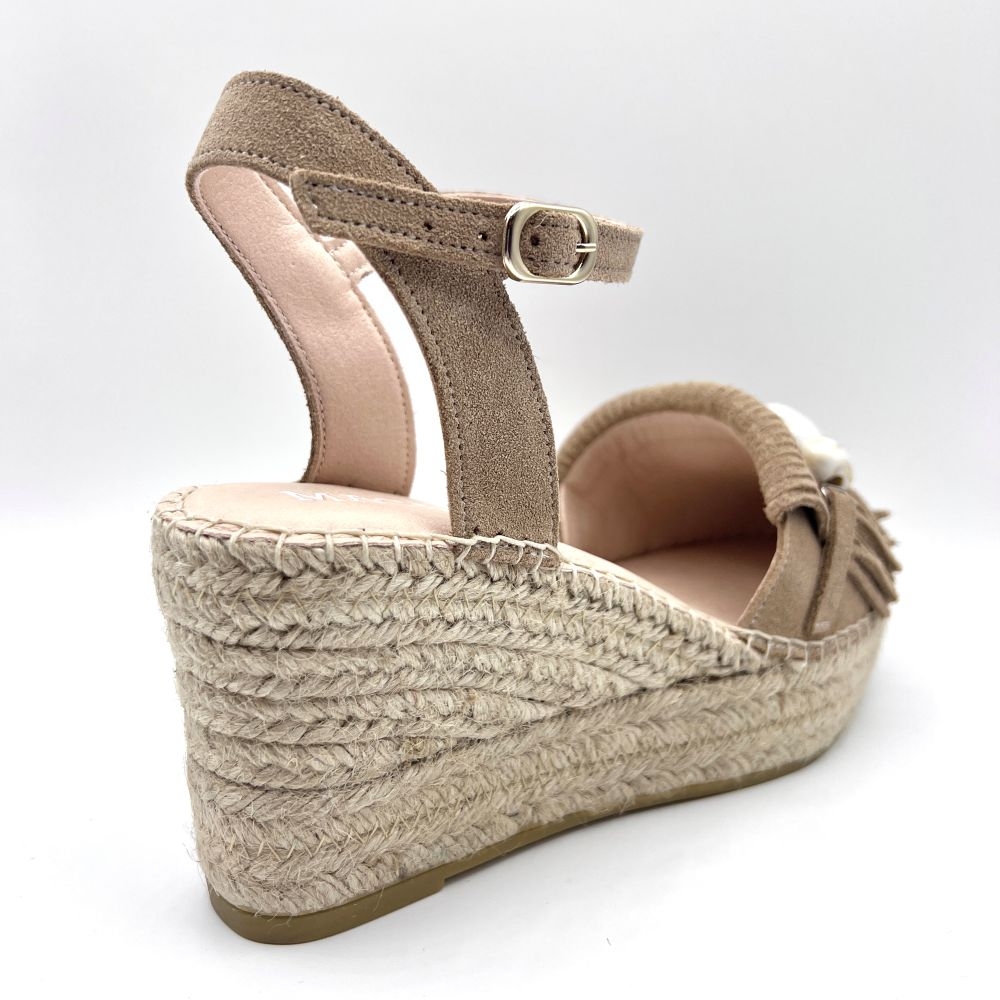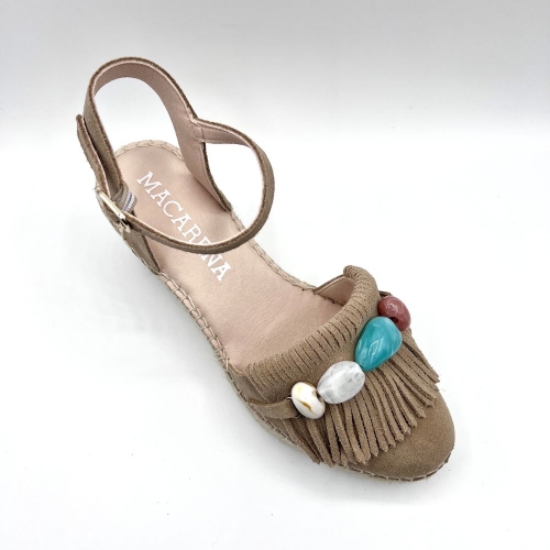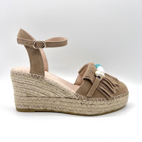 Sofisticadas y con una personalidad natural. Confeccionadas en suave serraje color topo, destacan por su pala adornada con delicados flecos que aportan movimiento y textura, creando un equilibrio perfecto entre elegancia relajada y tendencia.