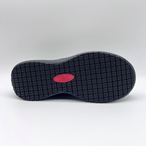 Este diseño TOUCHLESS FIT® para el trabajo presenta una parte superior sintética de knit con nuestra exclusiva Heel Pillow™ para el talón, una suela antideslizante y una cómoda plantilla con amortiguación Skechers Air-Cooled Memory Foam®.