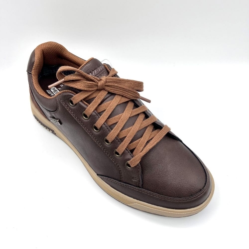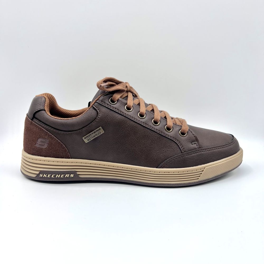 Este modelo waterproof con cordones presenta una parte superior de piel sintética lisa con ribete en el talón y una cómoda plantilla con amortiguación Skechers Air-Cooled Memory Foam®.