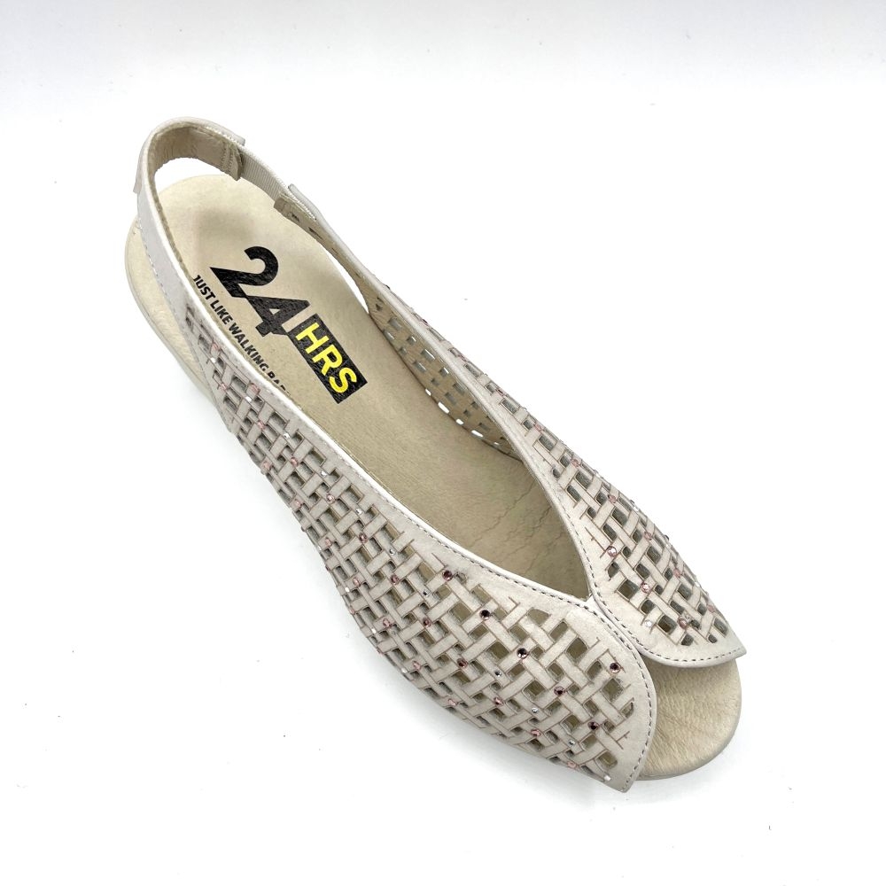 Peep toe mujer diseñado en piel calada crema con acabado en nobuck. Elástico lateral para facilitar el calzado, detalles en pedrería y costuras vistas. Suela bicolor PU alta calidad con cuña de 6 cm y tecnología exclusiva 24HRS. El clásico por excelencia de cada verano.