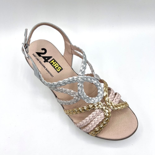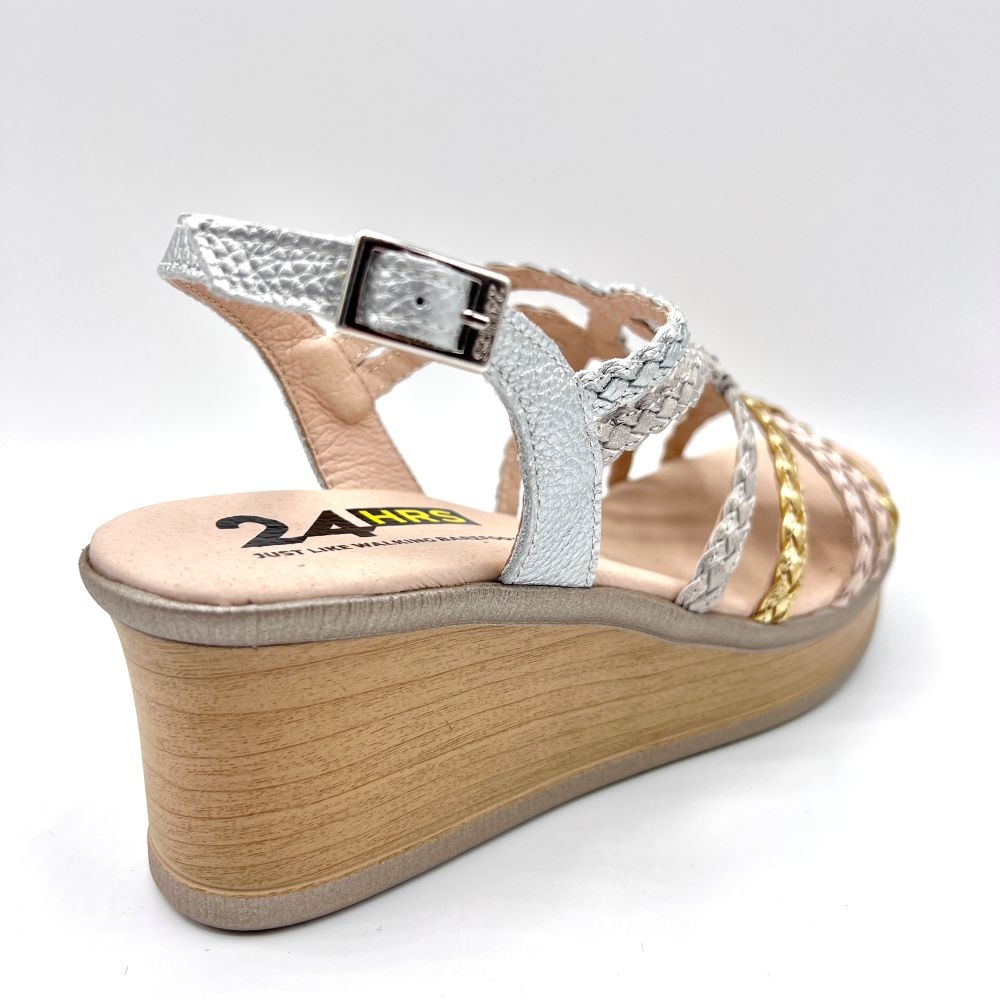 Sandalia mujer diseñada en piel combi metalizada alta selección con tiras trenzadas y cierre de hebilla lateral. Suela PU alta calidad con acabado natural, cuña de 7 cm y sensación total de confort. Es versátil, casual y está hecha para ti.
