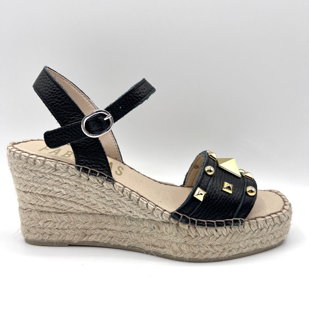 Sandalia abierta de cuña alta con puntera cuadrada elaborada en fantasy negro.
