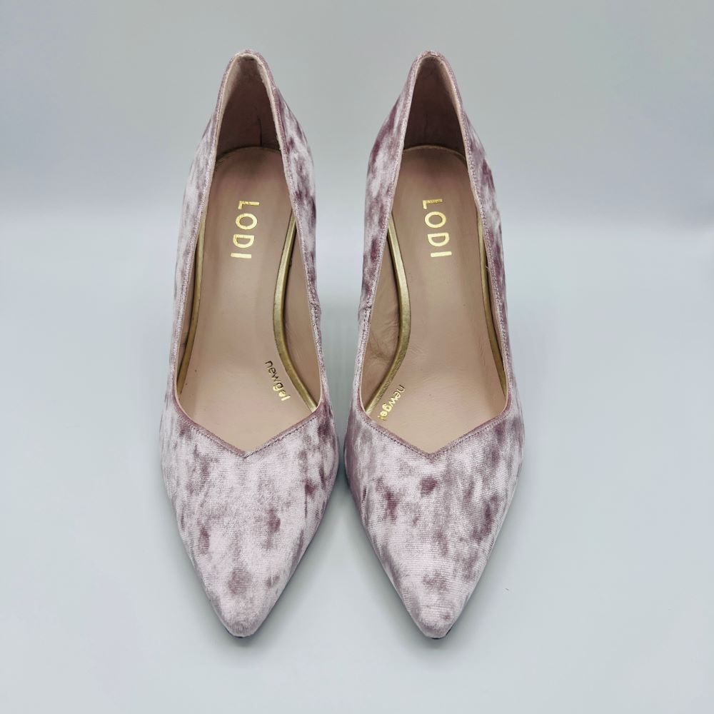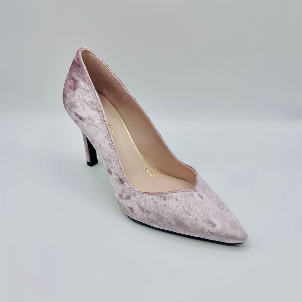 Zapatos de salón de mujer RABOT-TPTE de LODI en terciopelo de color rosa palo. Un diseño confeccionado con tacón de 9.5 cm de altura. Escote de pico. Interior forrado en piel. Incluye planta new gel para mayor comodidad en todas tus pisadas.