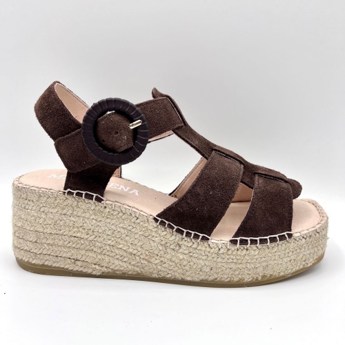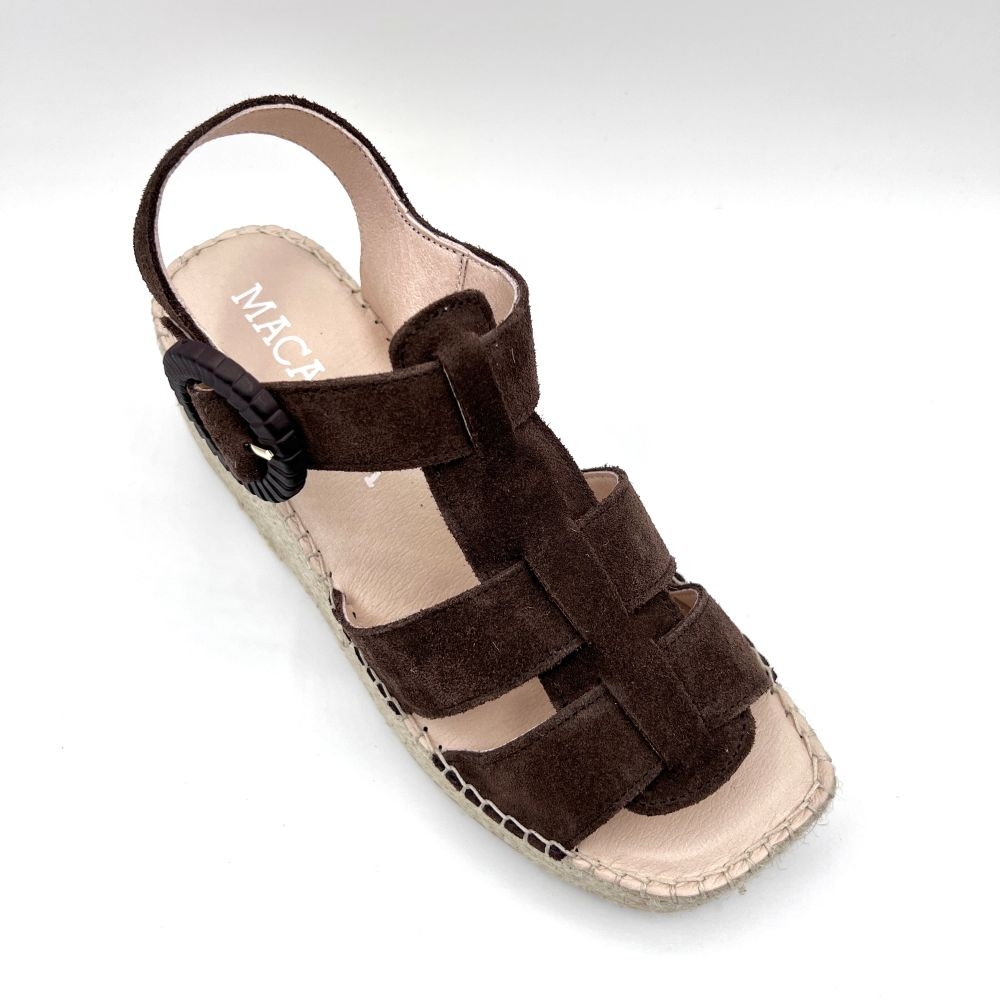 Artesanal, versátil y con carácter. Nuestra sandalia de plataforma con cuña en esparto y serraje color marrón café destaca por su diseño cruzado, elegante y funcional, perfecto para el día a día de verano.