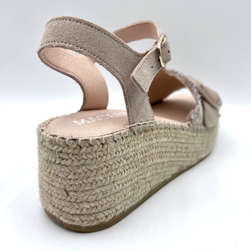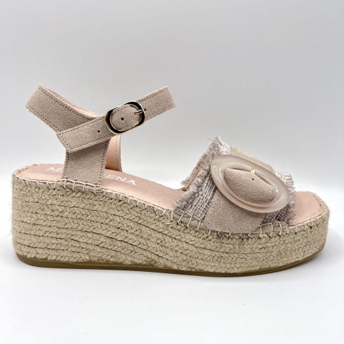 La gran hebilla circular en acabado tono neutro se convierte en el elemento protagonista del diseño, aportando carácter y un guiño distintivo que equilibra modernidad y artesanía. Su silueta estilizada se alza sobre una cuña de esparto natural trenzado, que refuerza su esencia y estiliza la figura con ligereza visual.