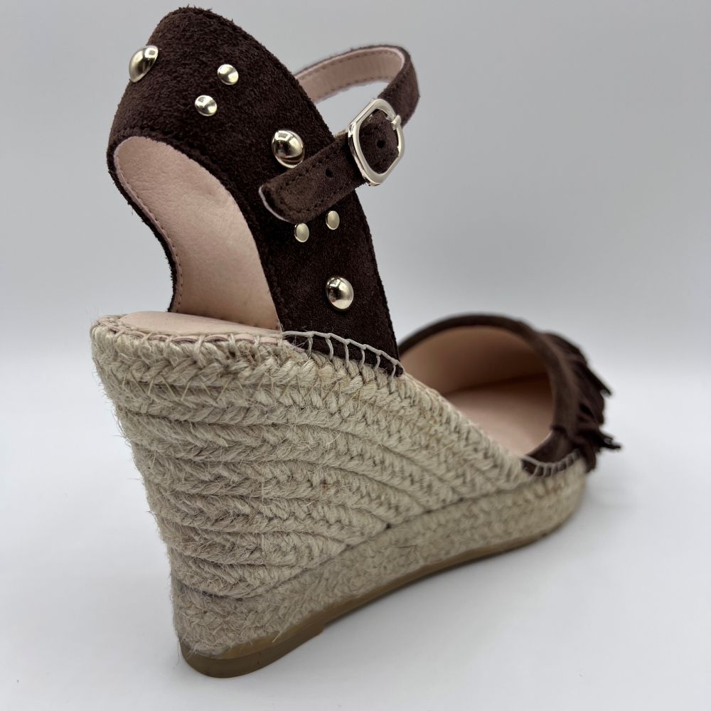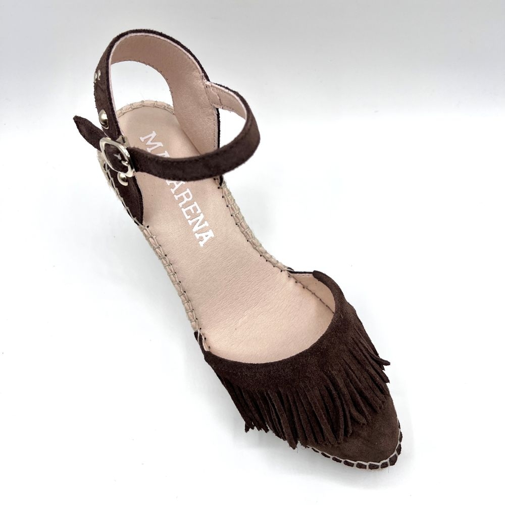 Femeninas y con un marcado aire artesanal. Confeccionadas en suave serraje color café, destacan por el delicado detalle de flecos en la pala, que aporta movimiento y un sutil guiño bohemio.