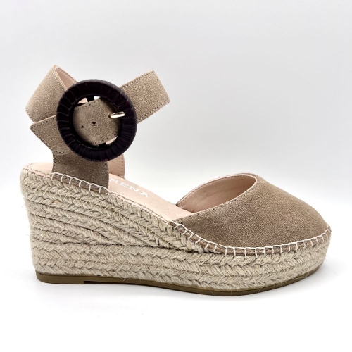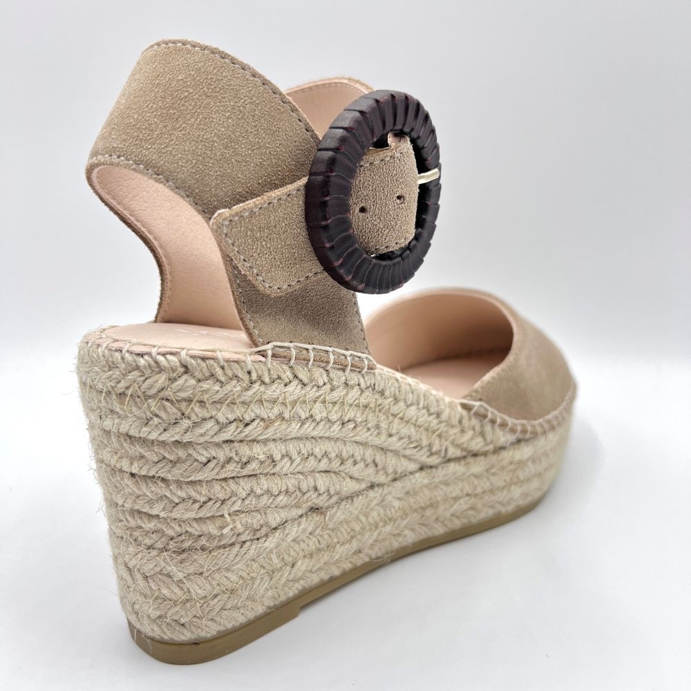 Sofisticadas y atemporales. Las alpargatas de cuña Yune, construidas en un suave serraje, son características por su hebilla.
