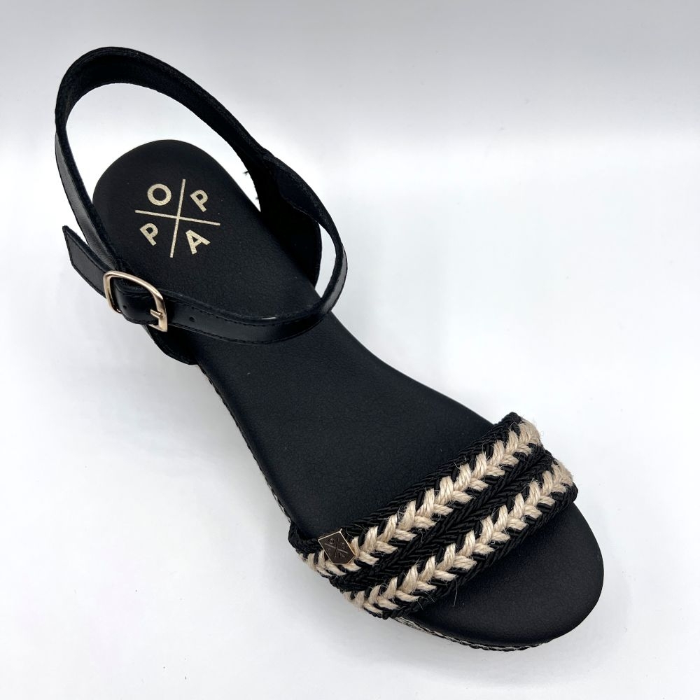 Sandalia de cuña baja negra. Fondo de armario imprescindible, ofrece pisada estable y estilo atemporal.