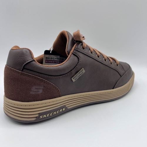 Este modelo waterproof con cordones presenta una parte superior de piel sintética lisa con ribete en el talón y una cómoda plantilla con amortiguación Skechers Air-Cooled Memory Foam®.